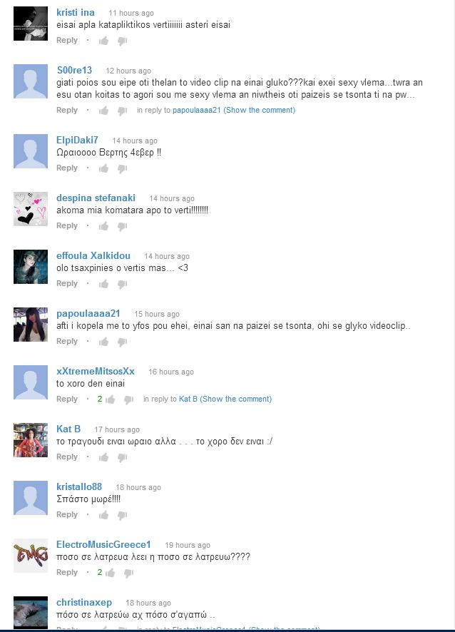 Ο Νίκος Βέρτης παρουσίασε το νέο του video clip “Ούτε που με νοιάζει” και ήδη έχει πολλά θετικά σχόλια στο κανάλι του στο YouTube. Ενδεικτικά μπορεί να δείτε μερικά από τα σχόλια των θαυμαστών στην φωτογραφία που ακολουθεί και φυσικά μπορείτε να προσθέσετε και τα δικά σας!